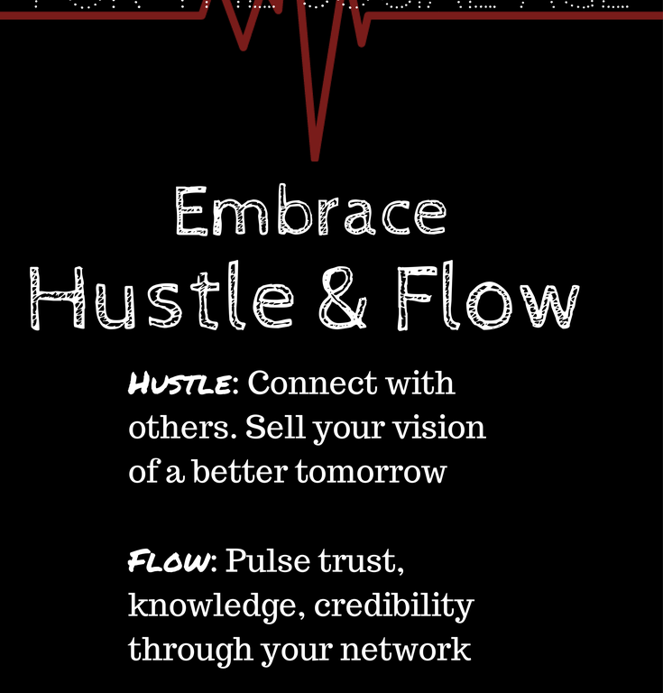 The flow is the counterpart. Flow can seem a little touchy-feely, so I like to marry it with hustle, to create the tension. Flow is about taking advantage of the network. Flow is also about picking up speed and energy. In combination, these two attributes are unstoppable, and you will be too.