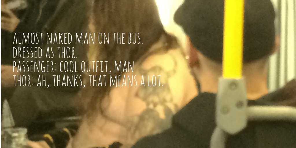 Example: look at the header photo… 364 days of the year, seeing a semi-naked man on the bus carrying a sledgehammer, kinda scary. Halloween context – perfect.