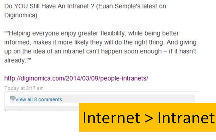 Meanwhile, in the real world, the internet solves ALL PROBLEMS! It effortlessly finds everything, entertains us, lets us feel in control of our own destiny of discovery. Intranets are crap – and should disappear, yesterday.