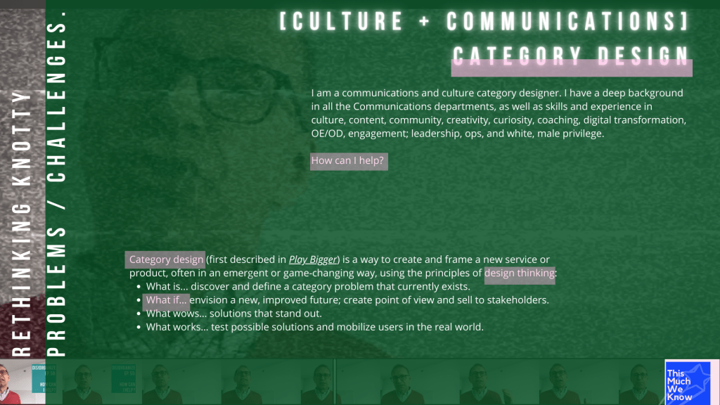I am a communications and culture category designer. I have a deep background in all the Communications departments, as well as skills and experience in culture, content, community, creativity, curiosity, coaching, digital transformation, OE/OD, engagement; leadership, ops, and white, male privilege.