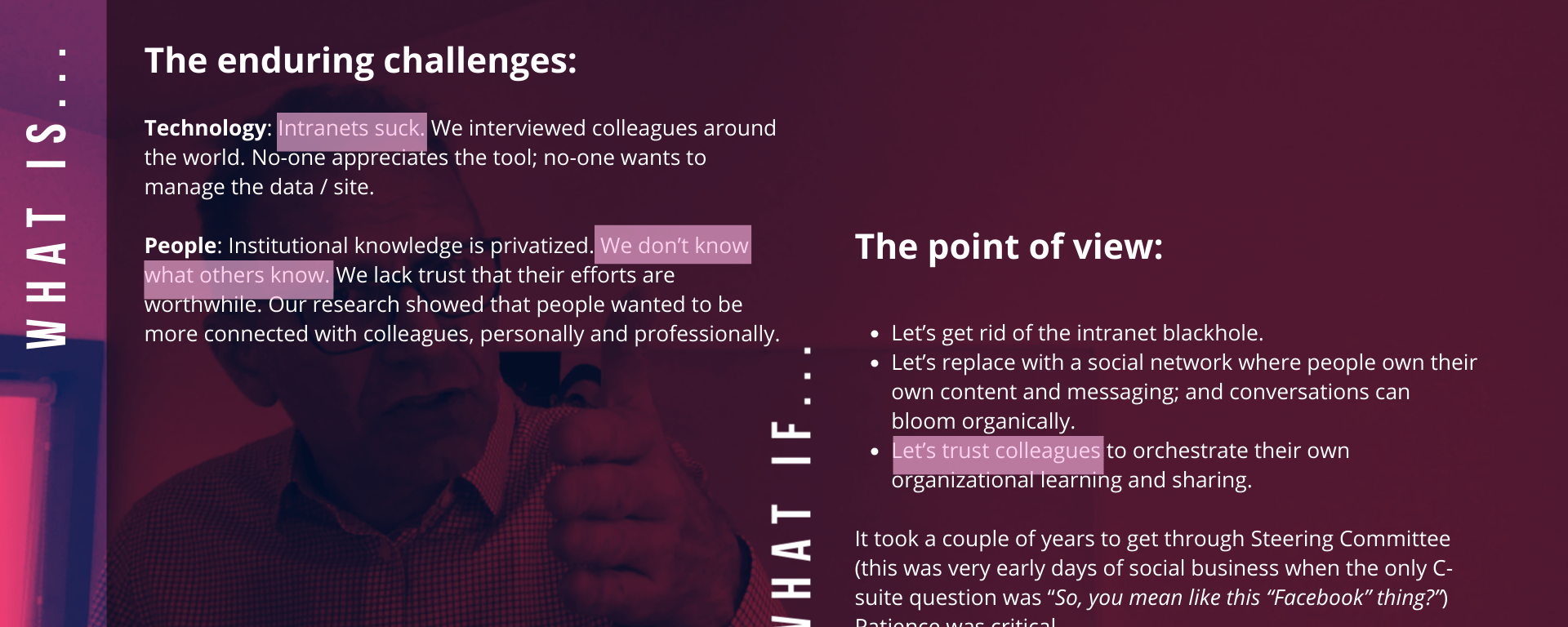 - Technology: Intranets suck. We interviewed colleagues around the world. No-one appreciates the tool; no-one wants to manage the data / site.