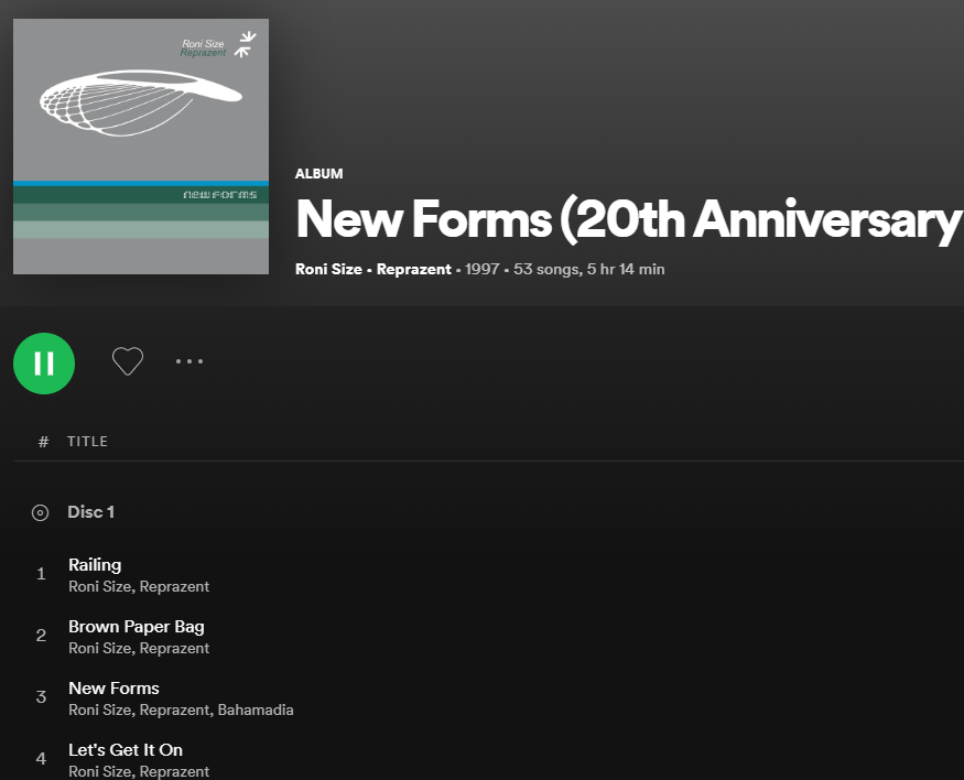 Today, I am in drum’n’bass mode – Roni Size: New Forms to be precise. 5 hours of pure synapsual, kinetic energy, taking me back to Liquid Room in Tokyo in the late 90s, all-nighter sessions through to the first train home around 0540 am.