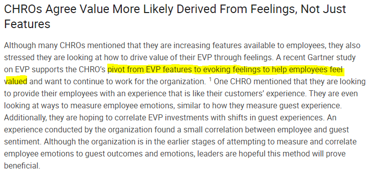This recent Gartner article surprises me only in that they seem to find it a new idea that we should focus on how people FEEL about work when defining the employee value proposition (EVP).